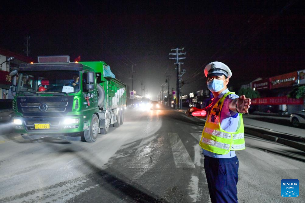 A traffic police officer directs the traffic as construction vehicles pass in Taitou Town of Jinghai District, north China's Tianjin Municipality, Aug. 9, 2023. The water level of the Taitou section of the Daqinghe River continued to rise, reaching about six meters on Wednesday morning. Rescue personnel patrol day and night over the villages and the river embankments are bolstered as a preparation for any emergency. (Xinhua/Sun Fanyue)