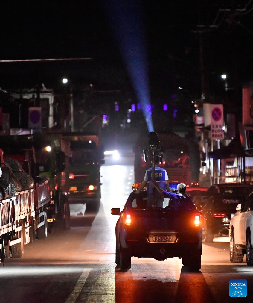 The Blue Sky Rescue Team's Tianjin Jinghai branch patrols in a village in Taitou Town of Jinghai District, north China's Tianjin Municipality, Aug. 6, 2023. The water level of the Taitou section of the Daqinghe River continued to rise, reaching about six meters on Wednesday morning. Rescue personnel patrol day and night over the villages and the river embankments are bolstered as a preparation for any emergency. (Xinhua/Sun Fanyue)
