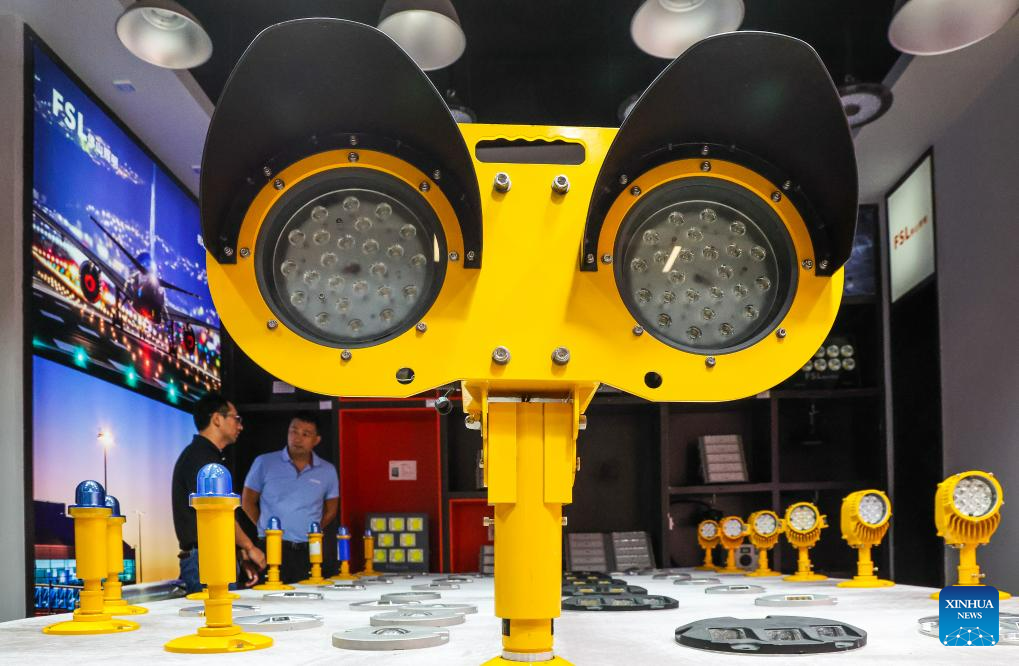 Lighting equipment of airport runway is displayed at an exhibition hall of Foshan Electrical and Lighting Co., Ltd. in Foshan, south China's Guangdong Province, Aug. 8, 2023. Foshan Electrical and Lighting Co., Ltd. (FSL) is one of the competitive lighting brands in China, providing full-range professional lighting solutions. The company has been actively engaging in the innovation of science and technology. Its lighting products have been applied to the deep-sea manned submersible, cultivation and aquaculture, and new energy vehicle manufacturing. (Xinhua/Liu Dawei)