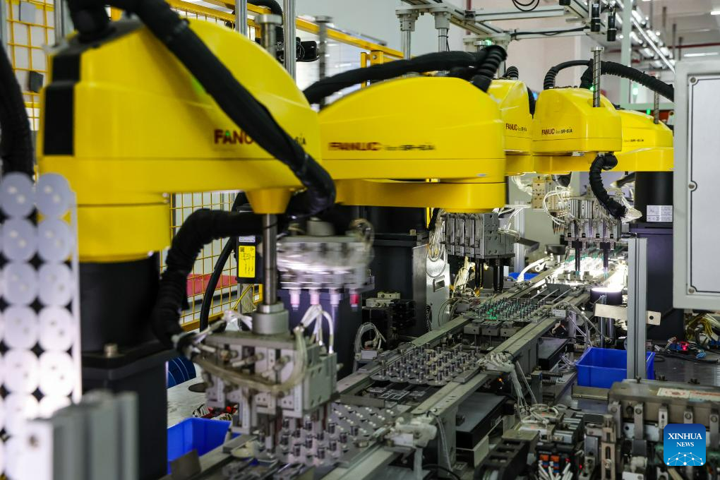 This photo taken on Aug. 9, 2023 shows industry robots working at a production base of Foshan Electrical and Lighting Co., Ltd. in Foshan, south China's Guangdong Province. Foshan Electrical and Lighting Co., Ltd. (FSL) is one of the competitive lighting brands in China, providing full-range professional lighting solutions. The company has been actively engaging in the innovation of science and technology. Its lighting products have been applied to the deep-sea manned submersible, cultivation and aquaculture, and new energy vehicle manufacturing. (Xinhua/Liu Dawei)