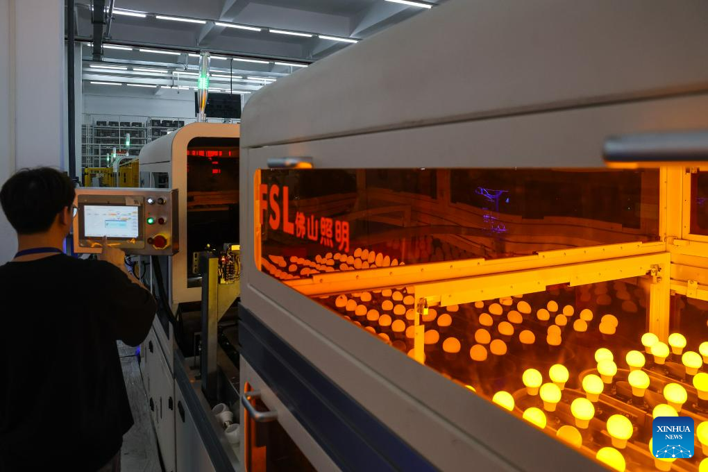 A staff member operates industry robots at a production base of Foshan Electrical and Lighting Co., Ltd. in Foshan, south China's Guangdong Province, Aug. 9, 2023. Foshan Electrical and Lighting Co., Ltd. (FSL) is one of the competitive lighting brands in China, providing full-range professional lighting solutions. The company has been actively engaging in the innovation of science and technology. Its lighting products have been applied to the deep-sea manned submersible, cultivation and aquaculture, and new energy vehicle manufacturing. (Xinhua/Liu Dawei)