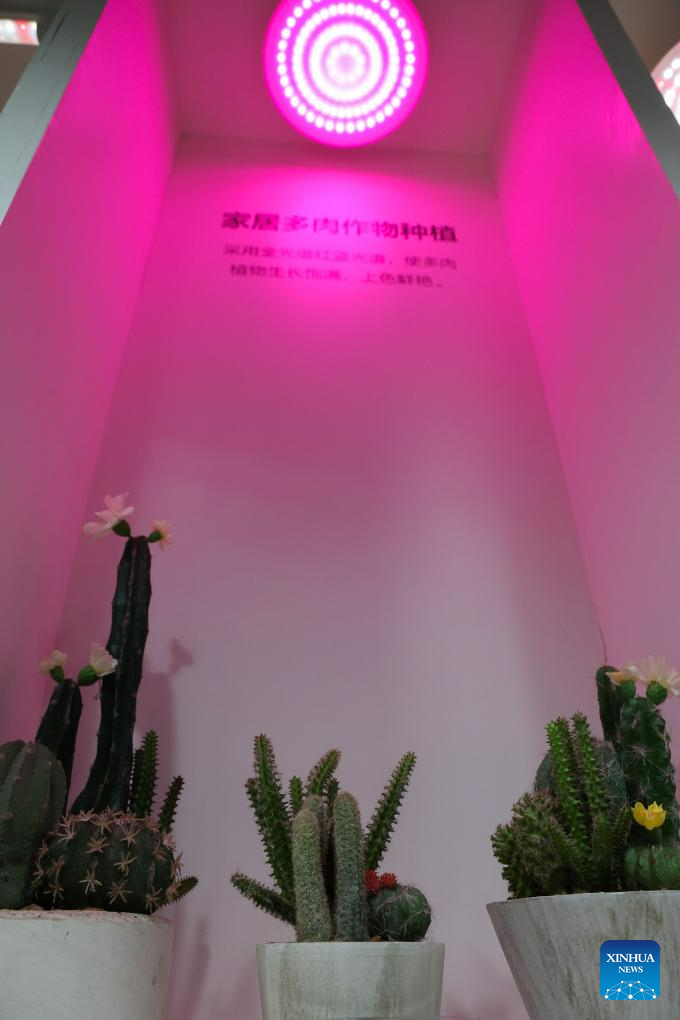 A lighting product is used to promote growth of succulent plants at an exhibition hall of Foshan Electrical and Lighting Co., Ltd. in Foshan, south China's Guangdong Province, Aug. 8, 2023. Foshan Electrical and Lighting Co., Ltd. (FSL) is one of the competitive lighting brands in China, providing full-range professional lighting solutions. The company has been actively engaging in the innovation of science and technology. Its lighting products have been applied to the deep-sea manned submersible, cultivation and aquaculture, and new energy vehicle manufacturing. (Xinhua/Liu Dawei)
