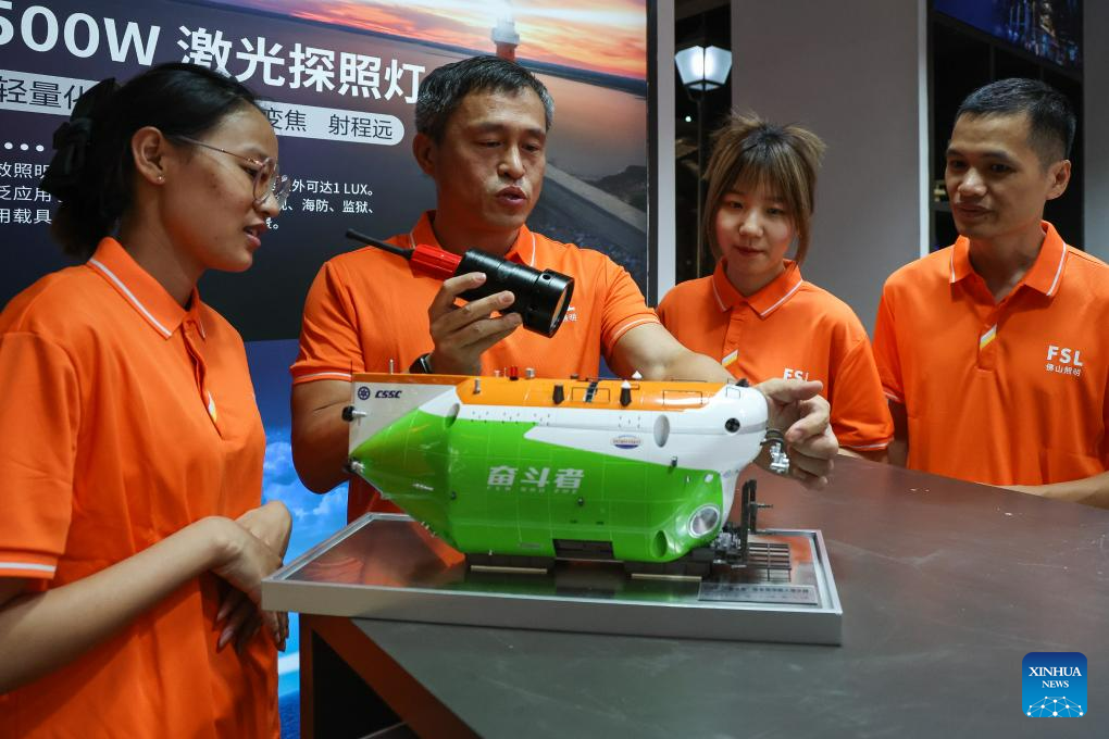 This undated file photo shows a fishing boat equipped with light products of Foshan Electrical and Lighting Co., Ltd. Foshan Electrical and Lighting Co., Ltd. (FSL) is one of the competitive lighting brands in China, providing full-range professional lighting solutions. The company has been actively engaging in the innovation of science and technology. Its lighting products have been applied to the deep-sea manned submersible, cultivation and aquaculture, and new energy vehicle manufacturing. (Foshan Electrical and Lighting Co., Ltd./Handout via Xinhua)