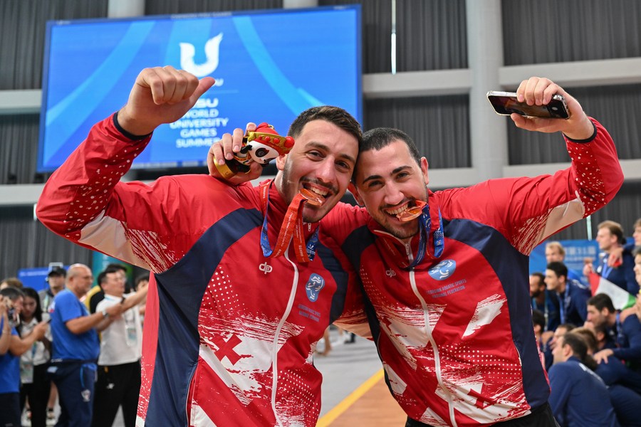 Bronze medalists of Team Georgia pose for photos after the awarding ceremony for men's water polo at the 31st FISU Summer World University Games in Chengdu, southwest China's Sichuan Province, Aug. 8, 2023. (Xinhua/Chen Zeguo)