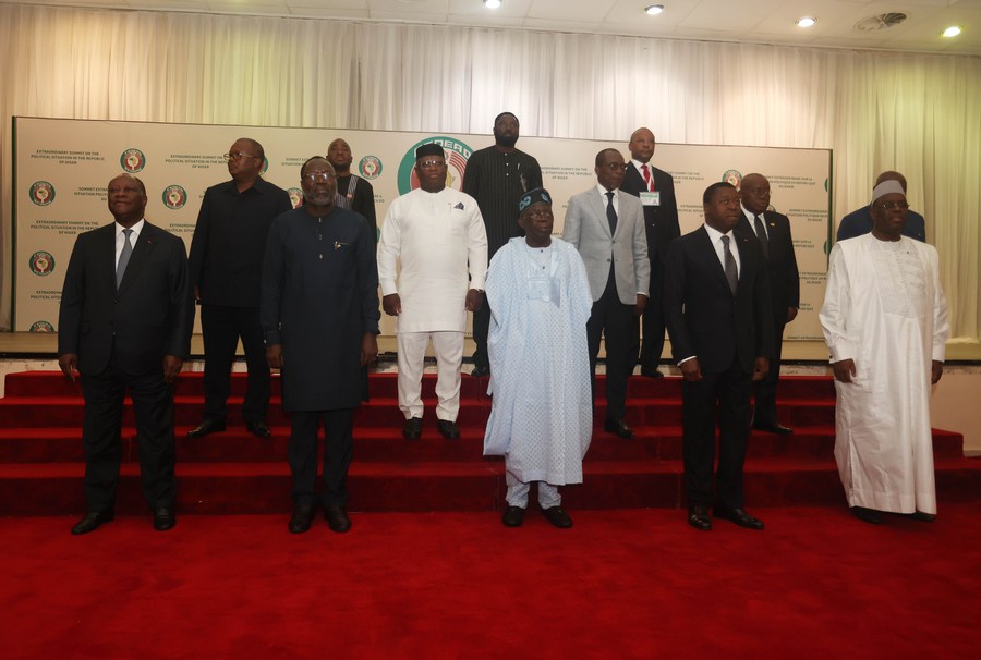 ECOWAS leaders pose for a photo at an extraordinary summit in Abuja, Nigeria, on Aug. 10, 2023. (Photo by Sodiq/Xinhua)