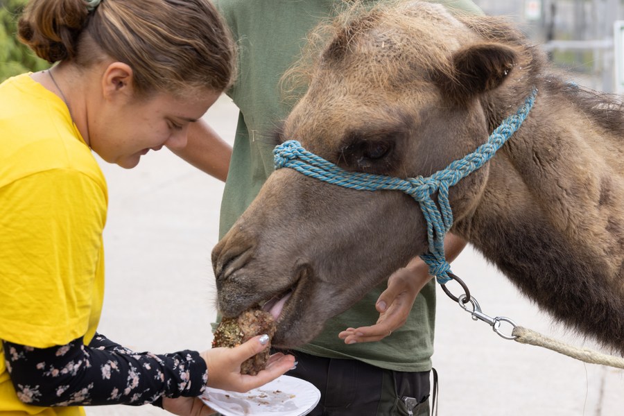 A Bactrian camel tastes a piece of special cake edible for both humans and animals at Budapest Zoo in Budapest, Hungary, Aug. 9, 2023. (Photo by Attila Volgyi/Xinhua)