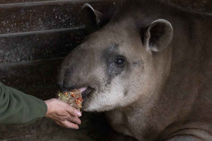 A lowland tapir tastes a piece of special cake edible for both humans and animals at Budapest Zoo in Budapest, Hungary, Aug. 9, 2023. (Photo by Attila Volgyi/Xinhua)