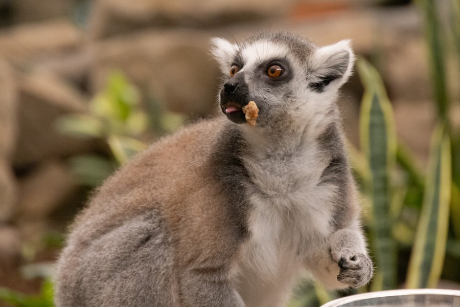 A ring-tailed lemur tastes a piece of special cake edible for both humans and animals at Budapest Zoo in Budapest, Hungary, Aug. 9, 2023. (Photo by Attila Volgyi/Xinhua)■