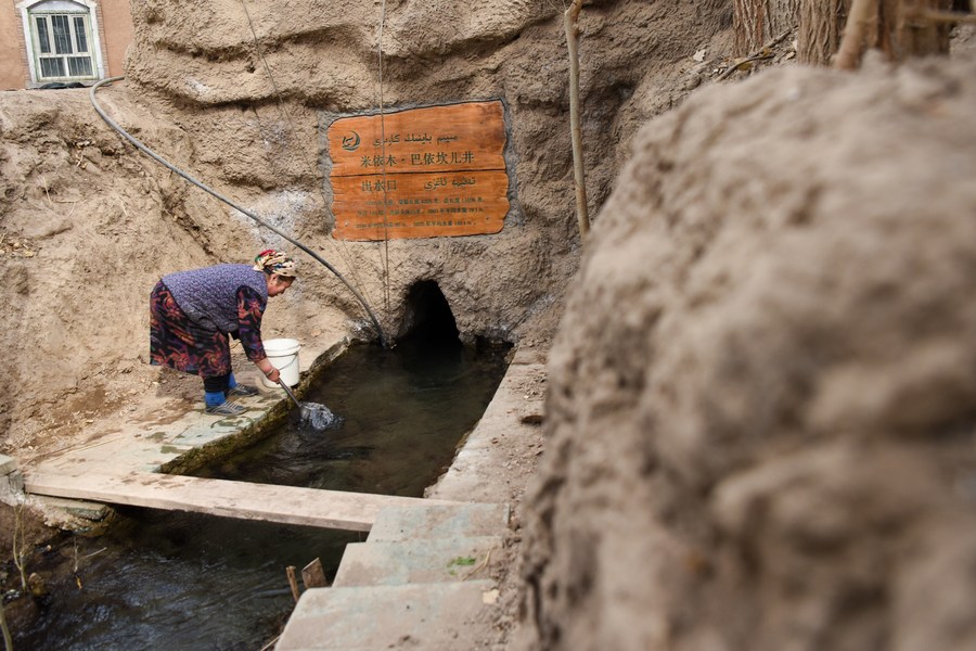 A resident fetches water from the outlet of a karez well in Turpan, northwest China's Xinjiang Uygur Autonomous Region, March 7, 2023. (Xinhua/Ding Lei)