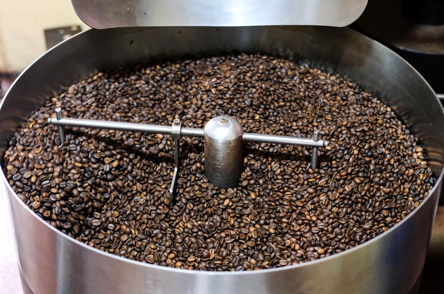 This photo taken on Aug. 7, 2023, shows coffee beans in roasting process at a local coffee roastery created by Gerald Katabazi in Kampala, Uganda. (Photo by Hajarah Nalwadda/Xinhua)