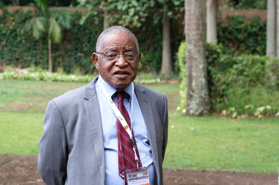 Ezra Suruma, Uganda's former finance minister and an economist, speaks to Xinhua on the sidelines of the 2nd G-25 Heads of State Africa Coffee Summit in Kampala, Uganda, on Aug. 7, 2023. (Photo by Hajarah Nalwadda/Xinhua)