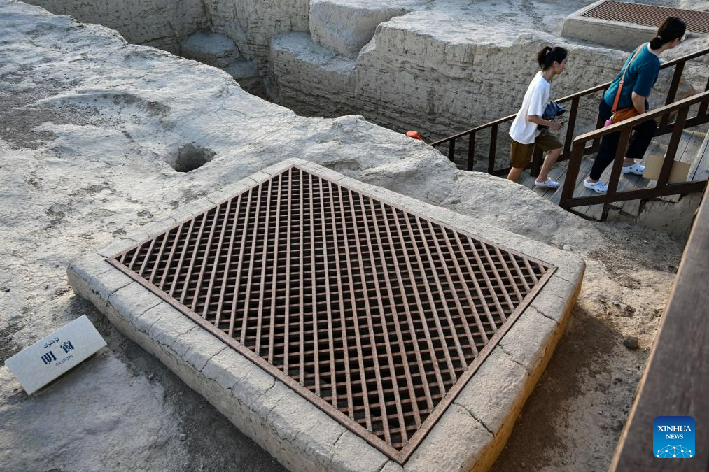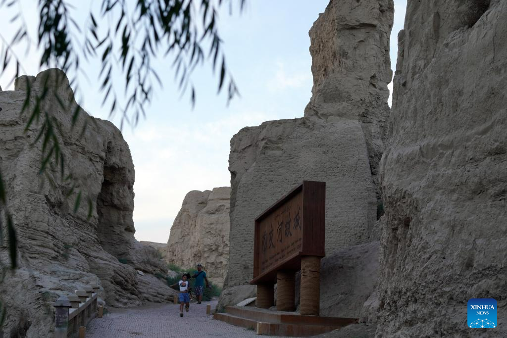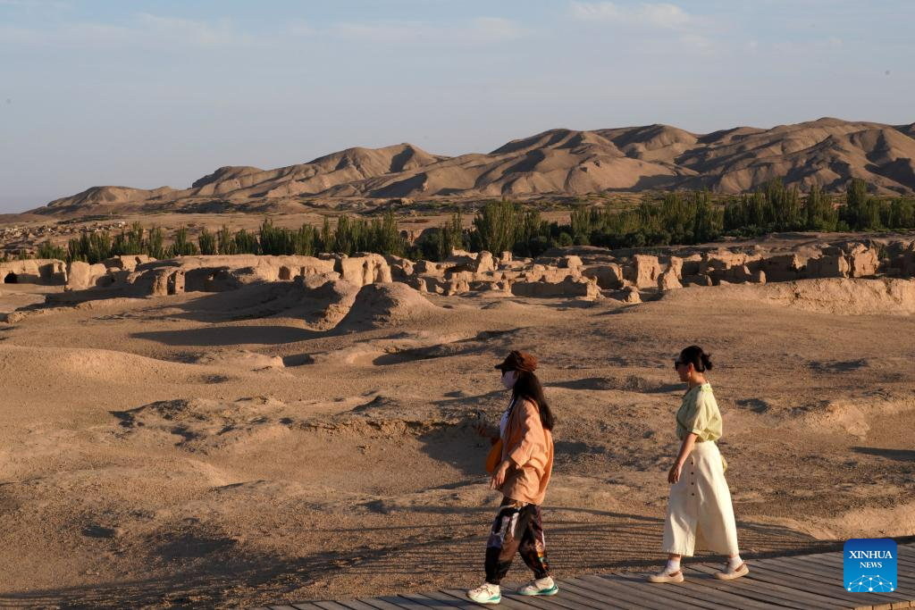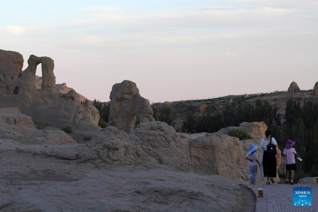 People visit the Jiaohe ancient city in Turpan, northwest China's Xinjiang Uygur Autonomous Region, Aug. 11, 2023. Jiaohe ancient city, located in the oasis north of the Turpan basin, was once an important town on the ancient Silk Road, and was listed as one of the first batch of national key cultural relic protection units in 1961. (Xinhua/Ma Ning)