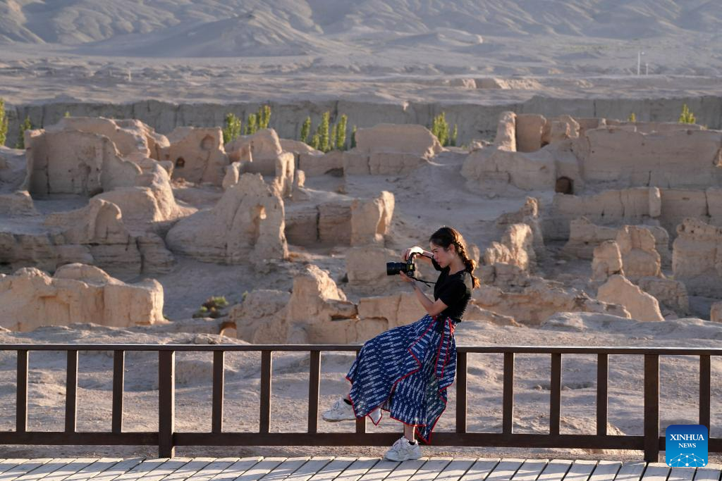 A visitor takes photos at the Jiaohe ancient city in Turpan, northwest China's Xinjiang Uygur Autonomous Region, Aug. 11, 2023. Jiaohe ancient city, located in the oasis north of the Turpan basin, was once an important town on the ancient Silk Road, and was listed as one of the first batch of national key cultural relic protection units in 1961. (Xinhua/Ma Ning)