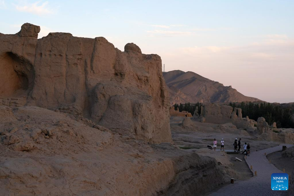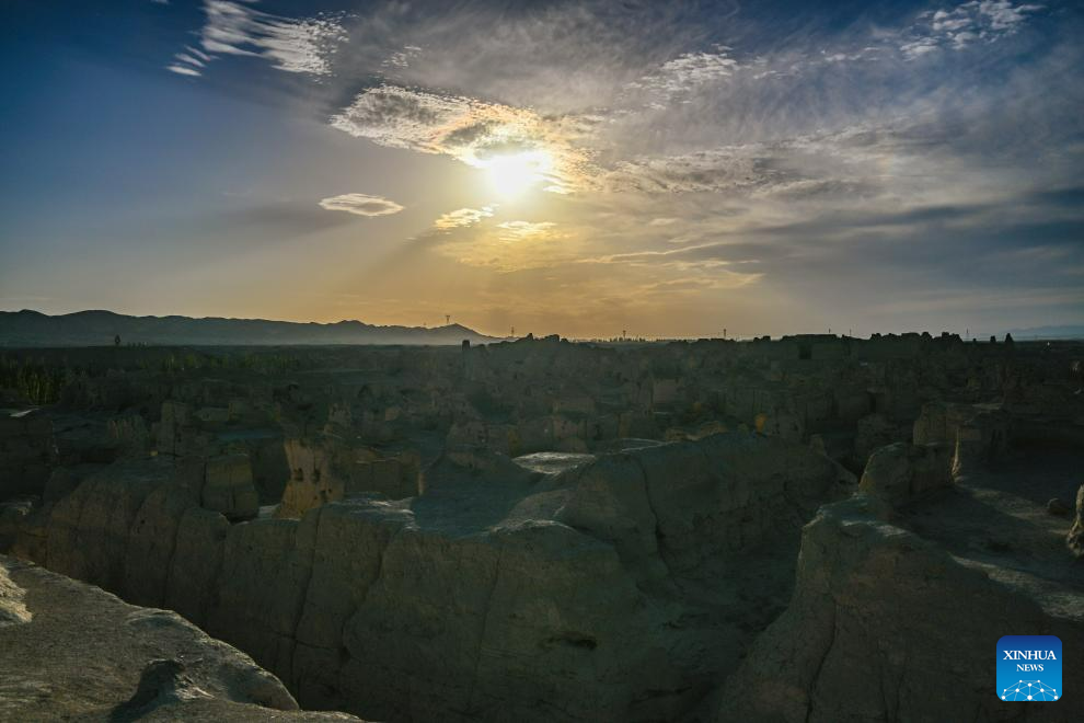 This photo taken on Aug. 11, 2023 shows the Jiaohe ancient city in sunset in Turpan, northwest China's Xinjiang Uygur Autonomous Region. Jiaohe ancient city, located in the oasis north of the Turpan basin, was once an important town on the ancient Silk Road, and was listed as one of the first batch of national key cultural relic protection units in 1961. (Xinhua/Ma Ning)