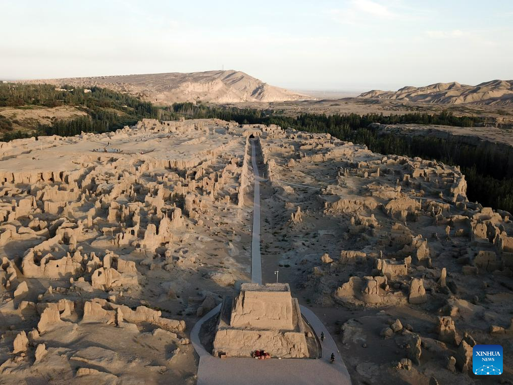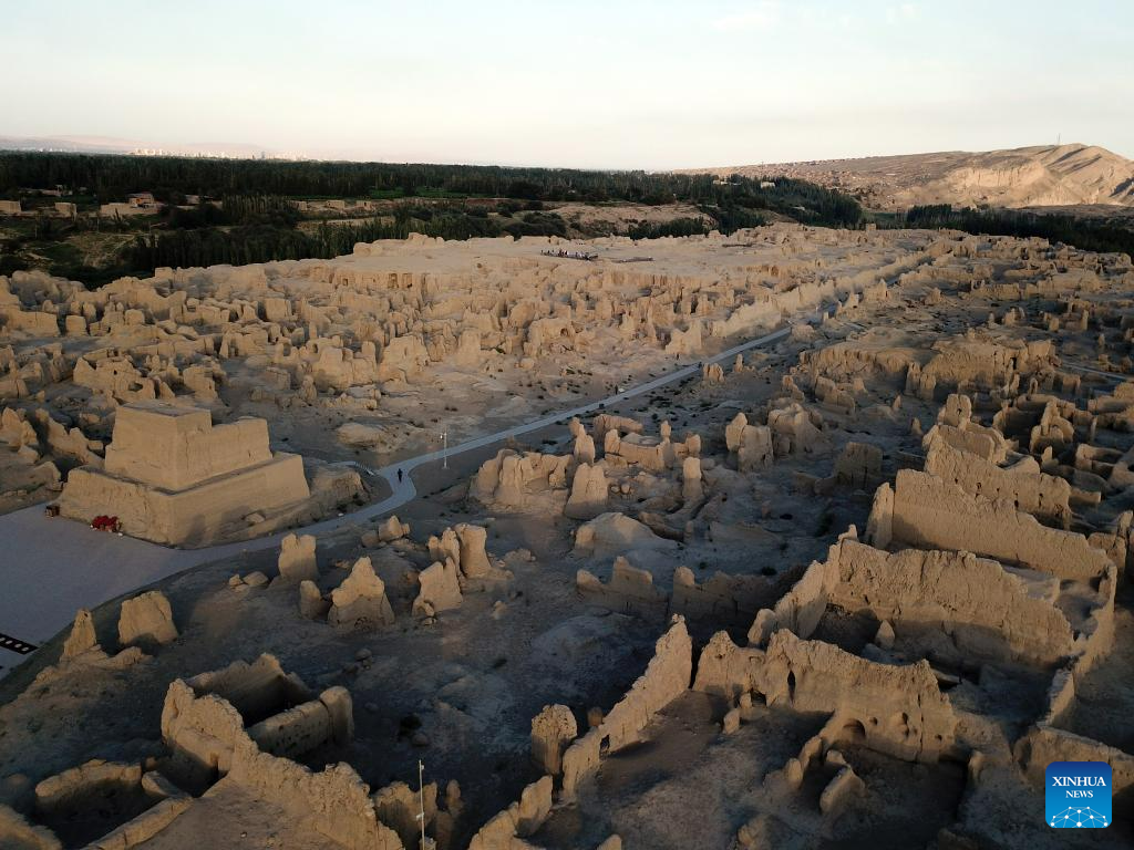 This aerial photo taken on Aug. 11, 2023 shows the Jiaohe ancient city in sunset in Turpan, northwest China's Xinjiang Uygur Autonomous Region. Jiaohe ancient city, located in the oasis north of the Turpan basin, was once an important town on the ancient Silk Road, and was listed as one of the first batch of national key cultural relic protection units in 1961. (Xinhua/Ma Ning)