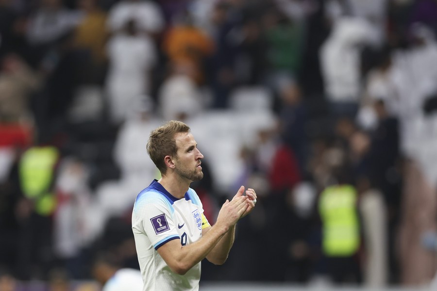 Harry Kane looks on after England's 2-1 quarterfinal defeat in the 2022 FIFA World Cup against France at Al Bayt Stadium in Qatar, Dec. 10, 2022. (Xinhua/Pan Yulong)