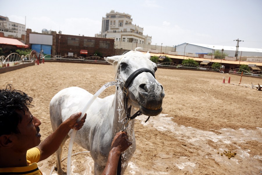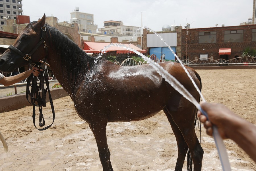 SANAA, Aug. 11 (Xinhua) -- "As the temperature soars, it's not just the people who suffer. Our animals are feeling the brunt of it too," shared Yahya al-Baidhany, a keeper of the Arabian horses at Al-Raad Equestrian School in Sanaa, Yemen's capital.