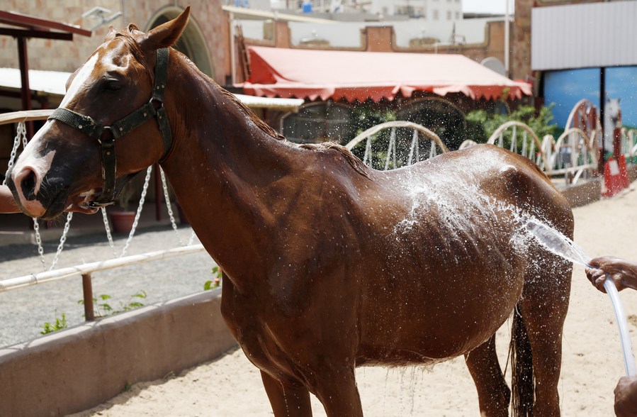 A keeper spays a horse with water to lower its body temperature amid scorching summer heat at an equestrian club in Sanaa, Yemen, on Aug. 4, 2023. (Photo by Mohammed Mohammed/Xinhua)■