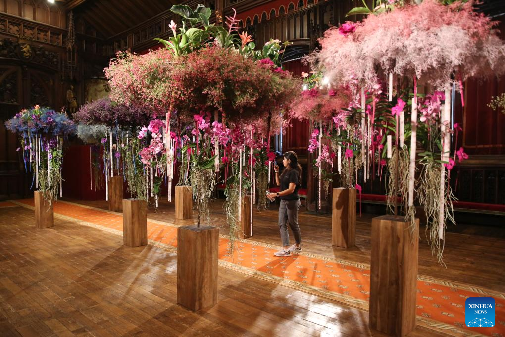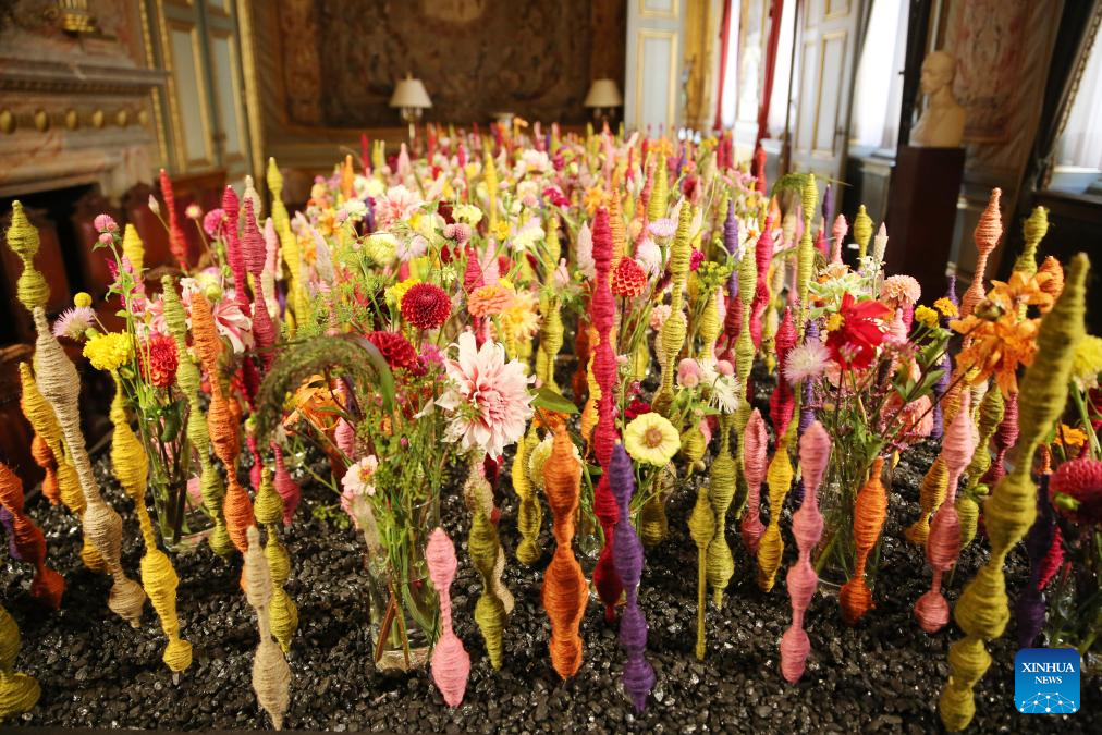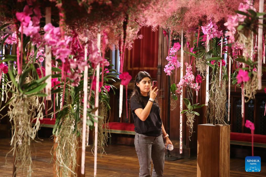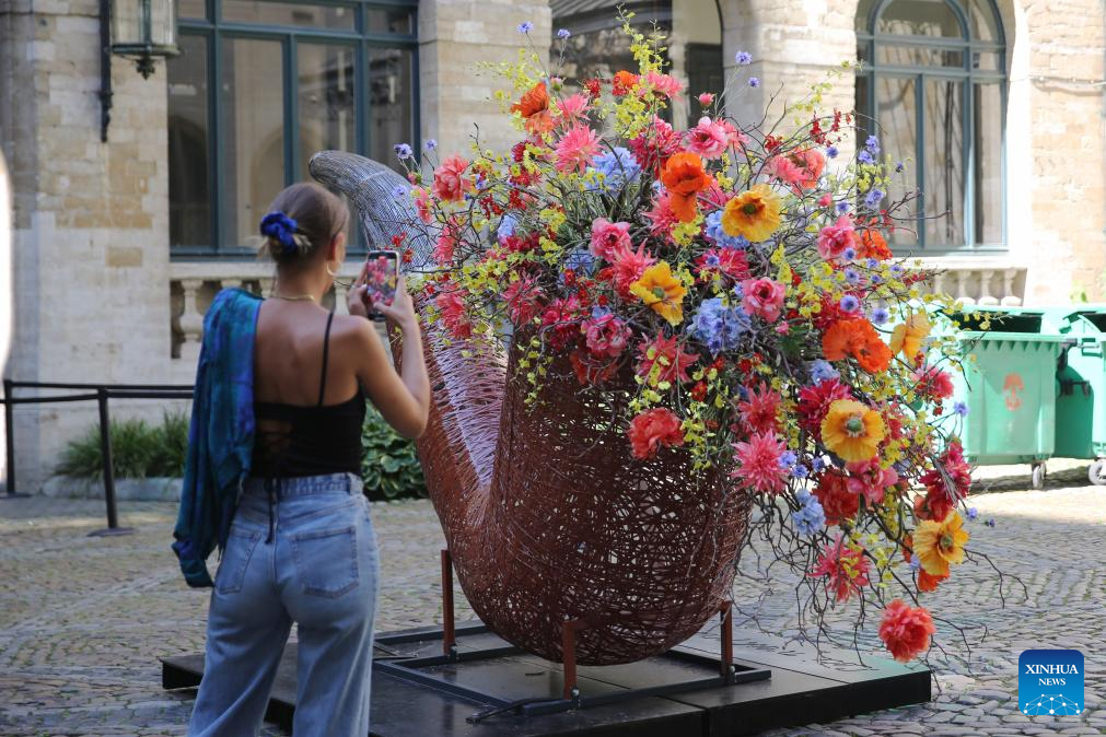 A piece of floral artwork is seen at the Flowertime exhibition in Brussels, Belgium, on Aug. 11, 2023. The Flowertime, a floral exhibition, is held in Brussels from Aug. 11 to Aug. 15 this year. (Xinhua/Zhao Dingzhe)