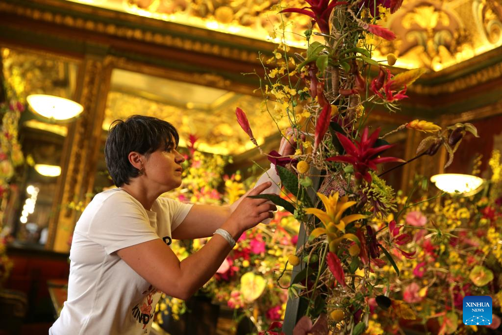 A floral artist adjusts her artwork at the Flowertime exhibition in Brussels, Belgium, on Aug. 11, 2023. The Flowertime, a floral exhibition, is held in Brussels from Aug. 11 to Aug. 15 this year. (Xinhua/Zhao Dingzhe)