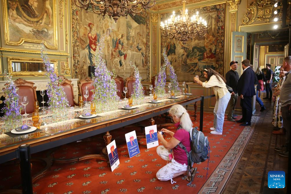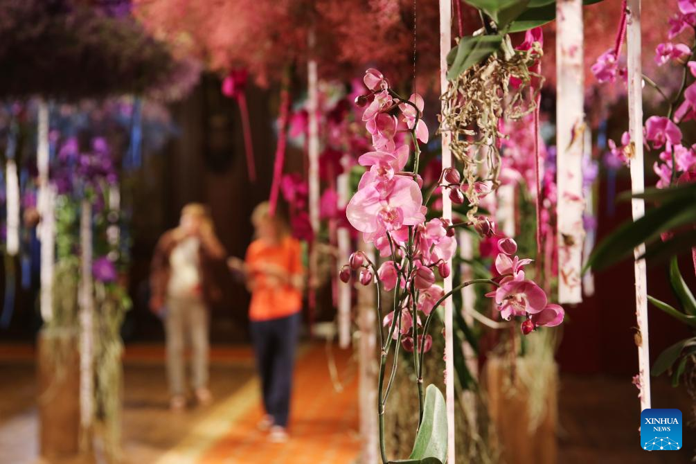 People visit the Flowertime exhibition in Brussels, Belgium, on Aug. 11, 2023. The Flowertime, a floral exhibition, is held in Brussels from Aug. 11 to Aug. 15 this year. (Xinhua/Zhao Dingzhe)