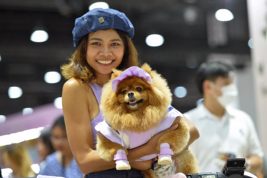 A visitor poses for photos with a pet dog during a pet expo in Bangkok, Thailand, on Aug. 10, 2023. (Xinhua/Rachen Sageamsak)