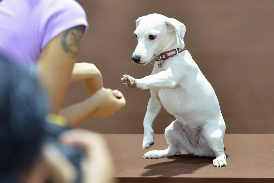 A visitor interacts with a pet dog during a pet expo in Bangkok, Thailand, on Aug. 10, 2023. (Xinhua/Rachen Sageamsak)
