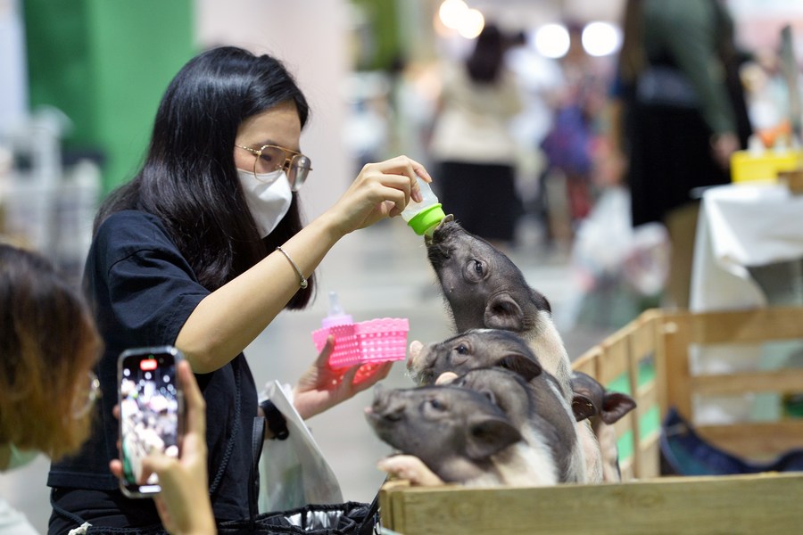 A visitor feeds piggies during a pet expo in Bangkok, Thailand, on Aug. 10, 2023. (Xinhua/Rachen Sageamsak)