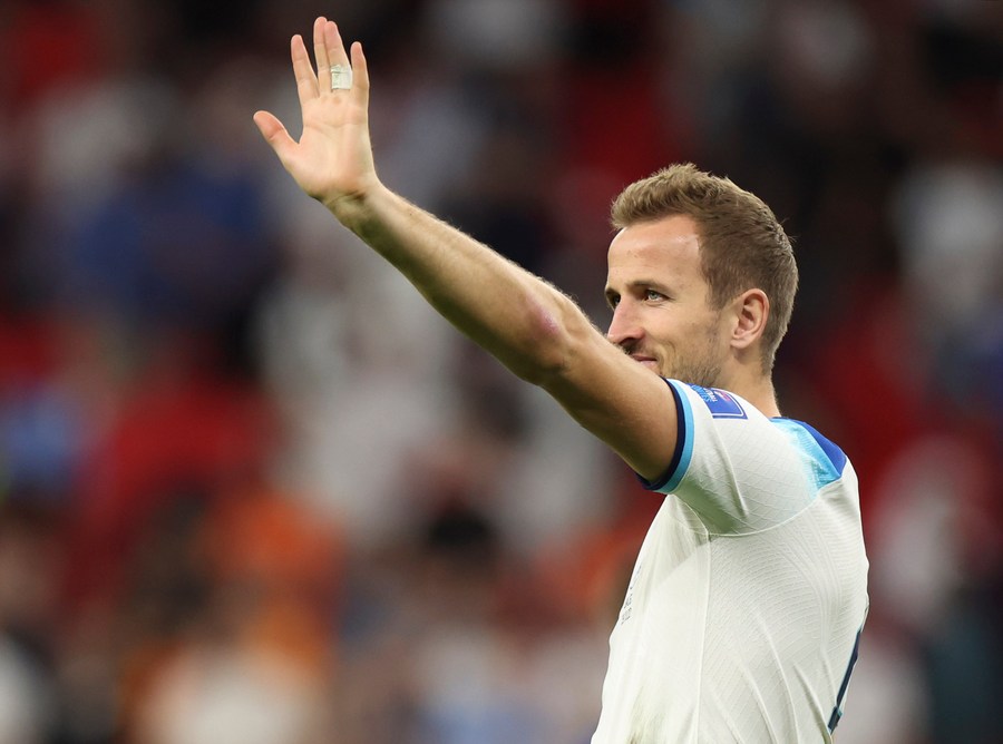 Harry Kane waves after the Group B match between Wales and England at the 2022 FIFA World Cup at Ahmad Bin Ali Stadium in Al Rayyan, Qatar on Nov. 29, 2022. (Xinhua/Han Yan)