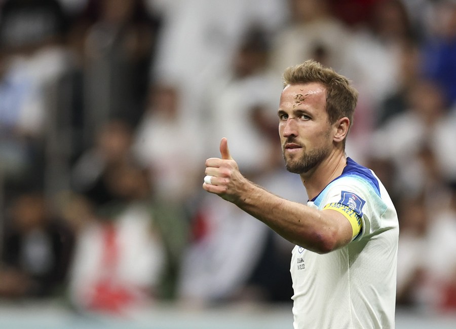 Kane gestures during the Round of 16 match between England and Senegal of the 2022 FIFA World Cup at Al Bayt Stadium in Al Khor, Qatar on Dec. 4, 2022. (Xinhua/Pan Yulong)