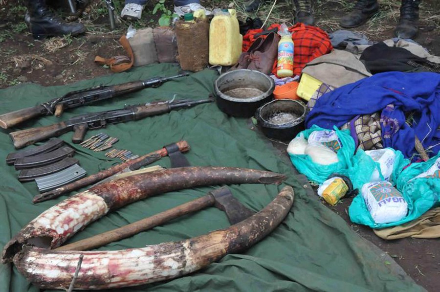 This photo taken on Oct. 31, 2010, shows the weapons and ivories seized by rangers of the Kenya Wildlife Service (KWS) during an operation at the Meru National Park near Isiolo in eastern Kenya. (Xinhua/Kenya Wildlife Services)