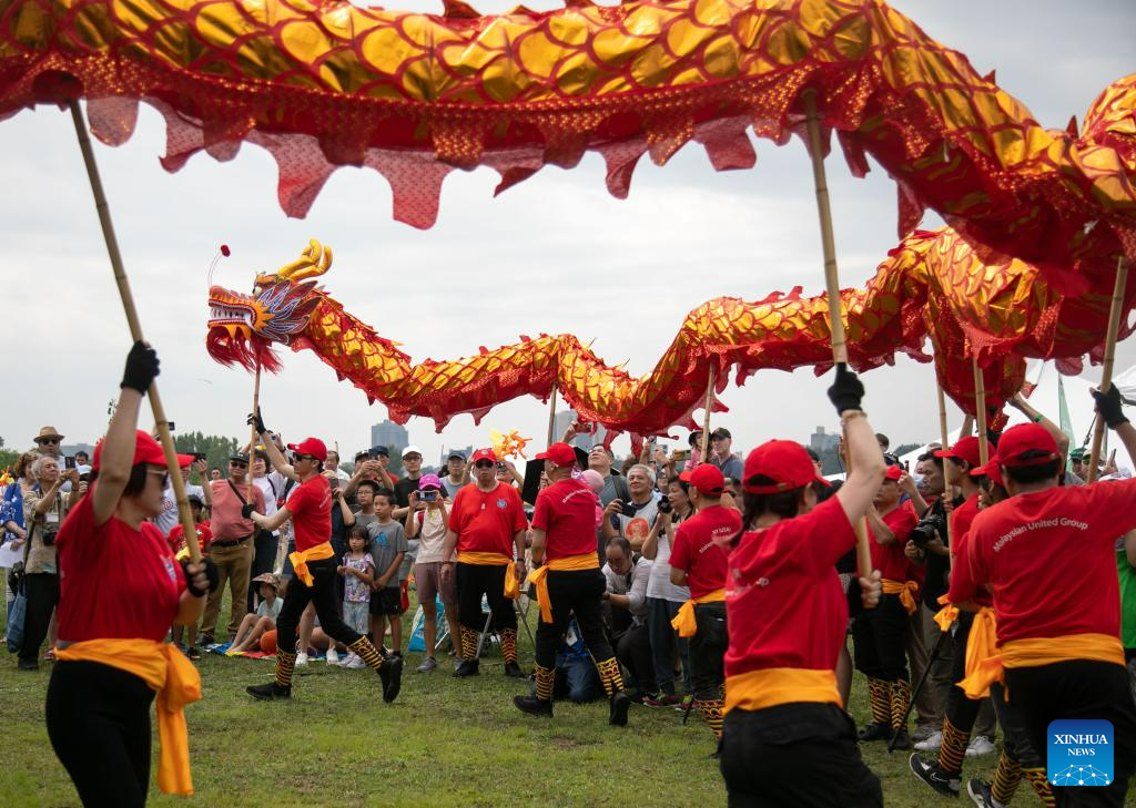 Dragon dancers perform during the 2023 Hong Kong Dragon Boat Festival in New York, the United States, on Aug. 12, 2023. The 31st Hong Kong Dragon Boat Festival, the largest of its kind in the United States, kicked off on Saturday at the Corona Park in New York City's Queens borough with plenty of fanfare.