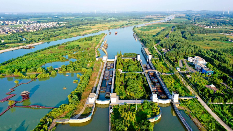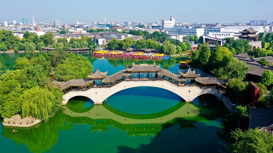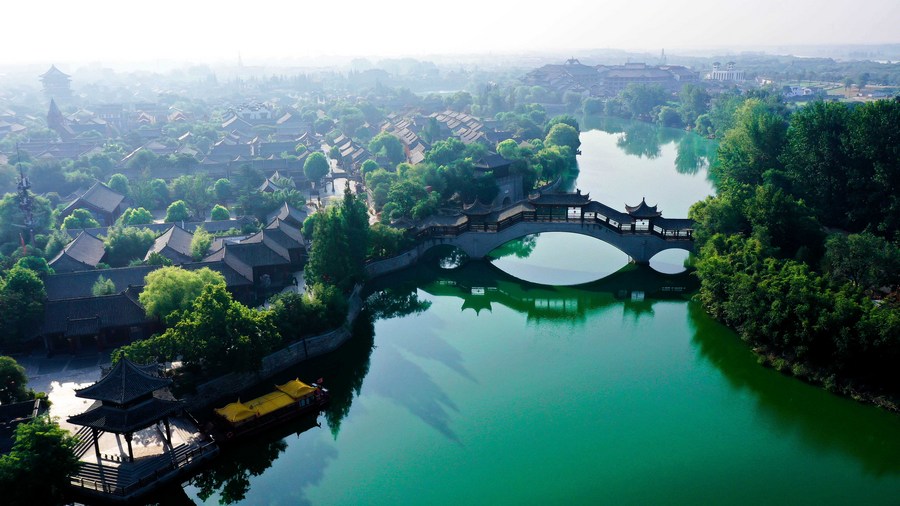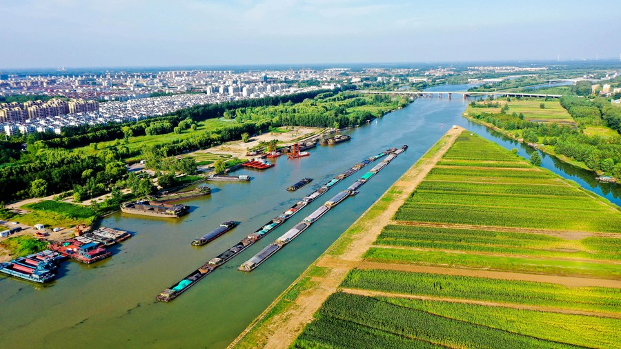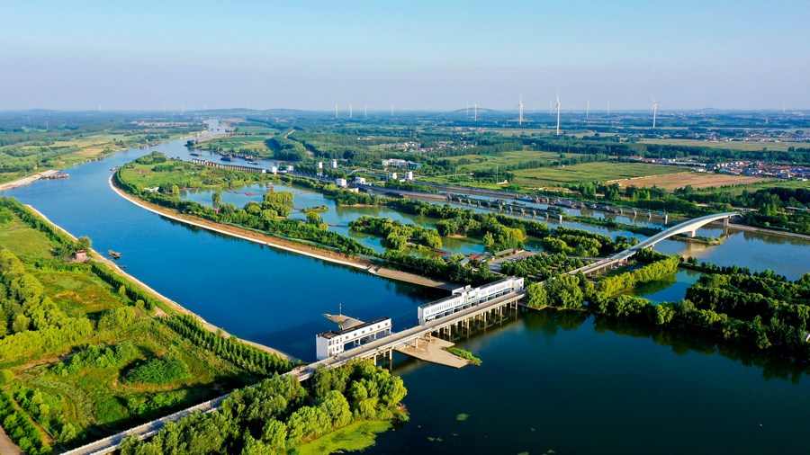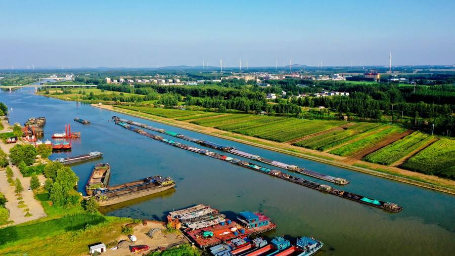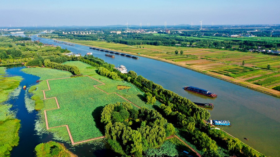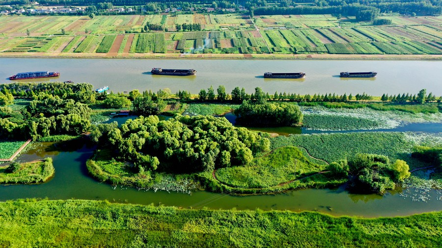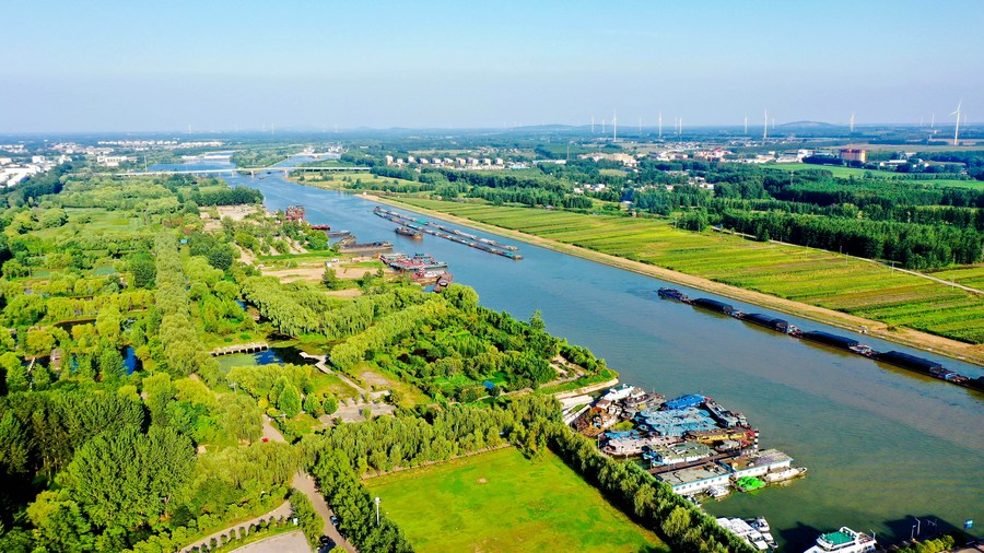 This aerial photo taken on Aug. 9, 2023 shows a view along the Zaozhuang section of the Beijing-Hangzhou Grand Canal in Taierzhuang District of Zaozhuang City, east China's Shandong Province. (Xinhua/Guo Xulei)