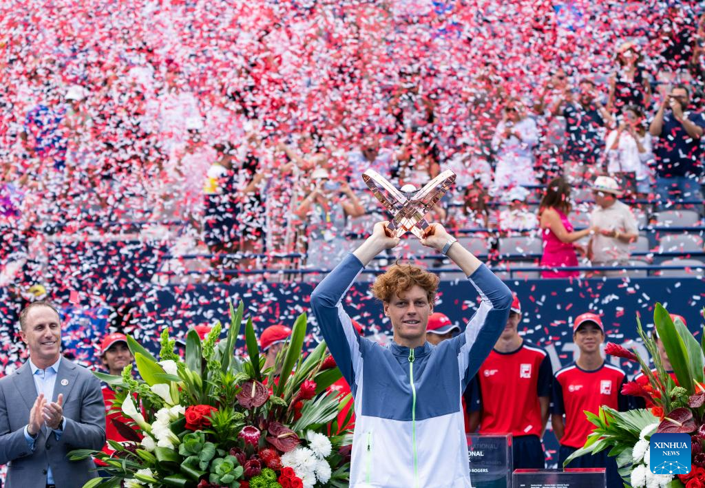 Jannik Sinner of Italy poses for photos with his trophy during the awarding ceremony after the men's singles final match between Jannik Sinner of Italy and Alex De Minaur of Australia at the 2023 National Bank Open in Toronto, Canada, on Aug. 13, 2023. (Photo by Zou Zheng/Xinhua)