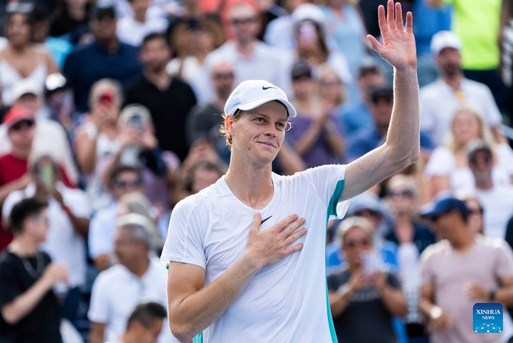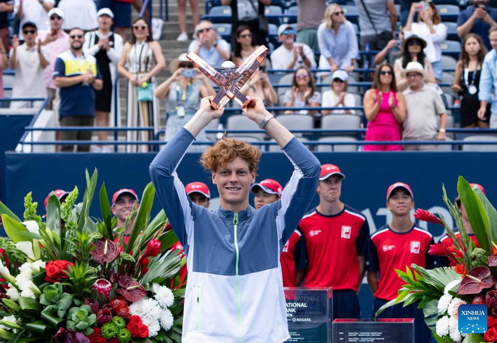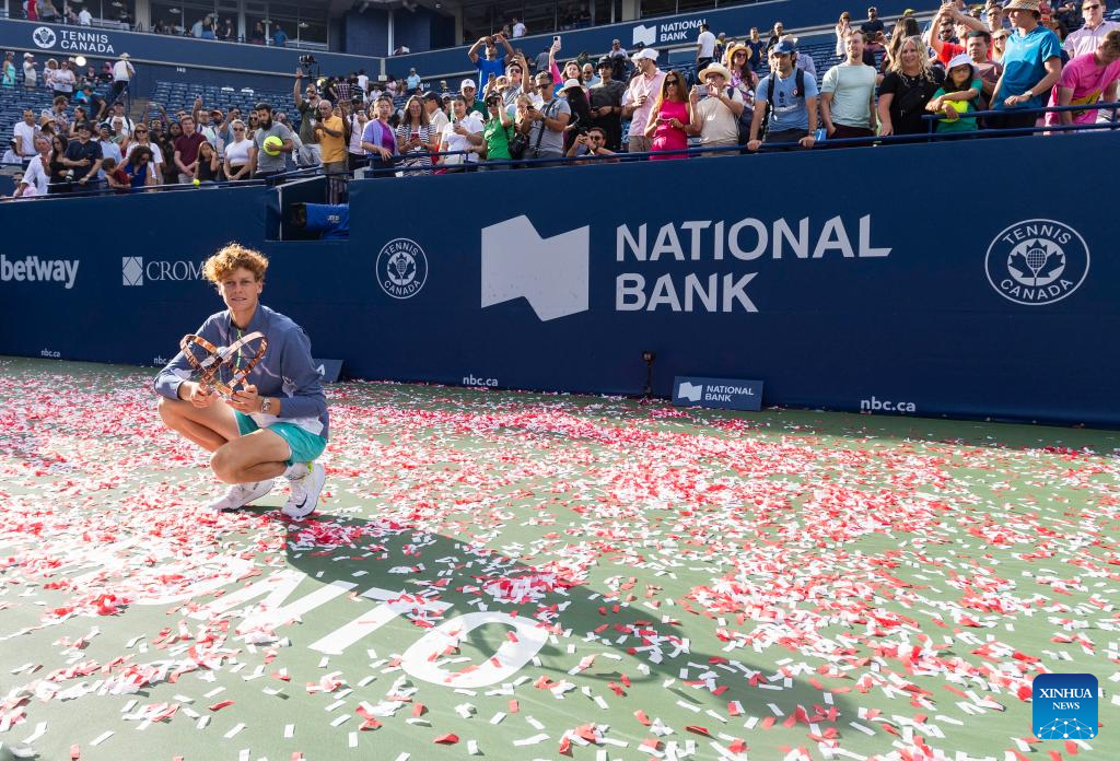 Jannik Sinner of Italy celebrates victory after the men's singles final match between Jannik Sinner of Italy and Alex De Minaur of Australia at the 2023 National Bank Open in Toronto, Canada, on Aug. 13, 2023. (Photo by Zou Zheng/Xinhua)
