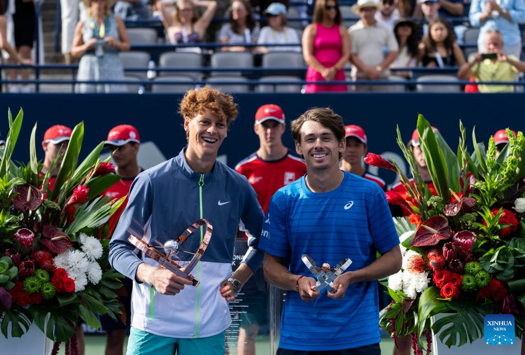 Jannik Sinner (L) of Italy, Alex De Minaur of Australia pose for photos with their trophies during the awarding ceremony after their men's singles final match at the 2023 National Bank Open in Toronto, Canada, on Aug. 13, 2023. (Photo by Zou Zheng/Xinhua)