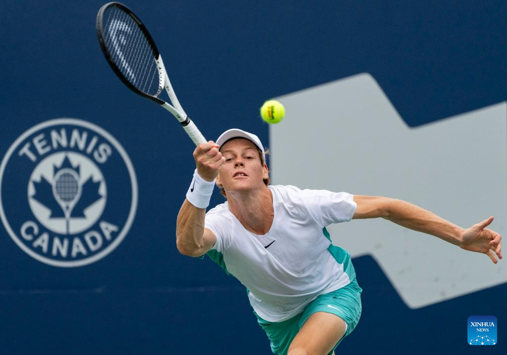 Jannik Sinner of Italy returns the ball during the men's singles final match between Jannik Sinner of Italy and Alex De Minaur of Australia at the 2023 National Bank Open in Toronto, Canada, on Aug. 13, 2023. (Photo by Zou Zheng/Xinhua)