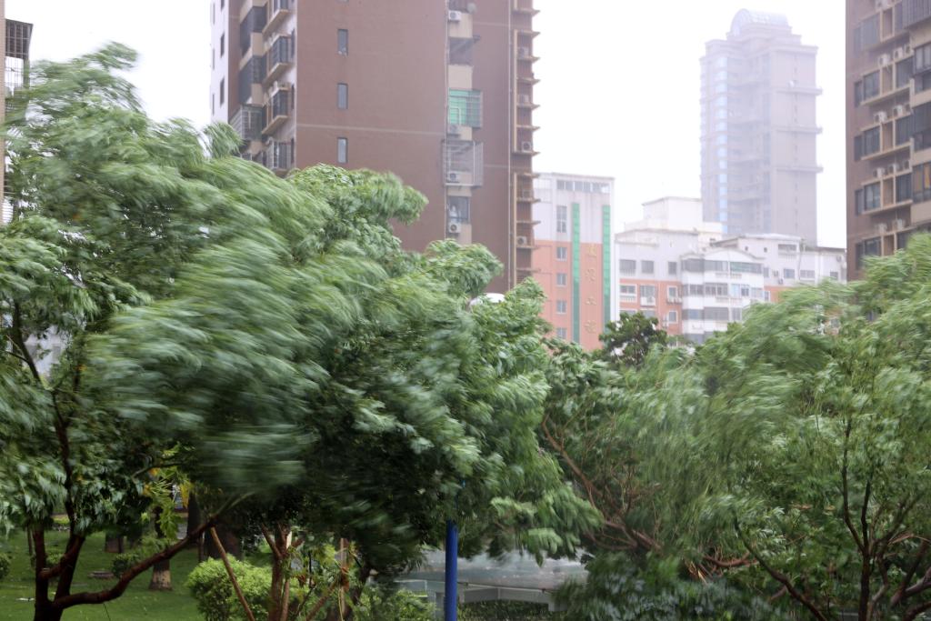 Trees swing amid strong wind in Siming District of Xiamen, southeast China's Fujian Province, July 28, 2023. (Photo by Zeng Demeng/Xinhua)