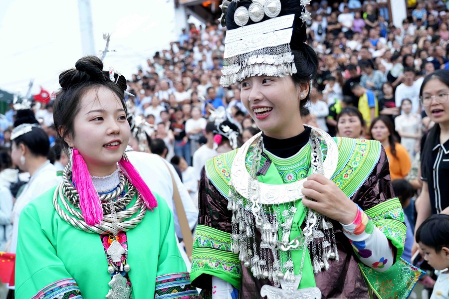 Villagers wearing ethnic dress enter the stadium to watch games. (Photo by Wang Bingzhen/Xinhua)