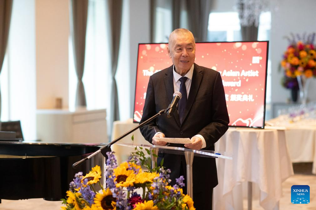 Chinese piano maestro Liu Shikun speaks at a ceremony of the Most Outstanding Asian Artist Lifetime Achievement Award in New York City, the United States, Aug. 12, 2023. Liu Shikun, an 84-year-old Chinese piano maestro, has been honored with the Most Outstanding Asian Artist Lifetime Achievement Award in New York City over the weekend. (Chinese American Arts Council/Sandy Fan/Handout via Xinhua)