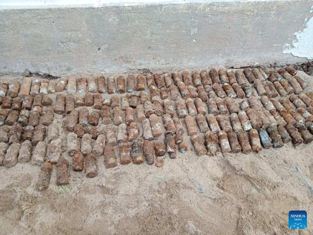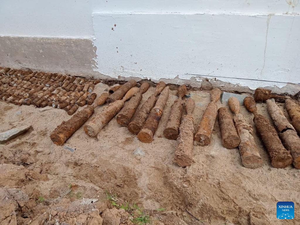 This photo taken on Aug. 13, 2023 shows a mass of war-era unexploded ordnance unearthed from the grounds of a high school in Kratie province, Cambodia. The Cambodian Mine Action Center (CMAC) experts have recovered more than 2,000 pieces of war-era unexploded ordnance (UXO) buried on a school campus in northeastern Kratie province, a mine clearance chief said on Monday. (CMAC/Handout via Xinhua)