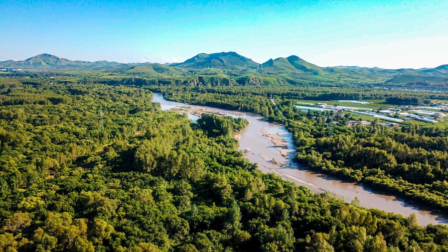 This aerial photo shows a view of the Tao'erhe National Wetland Park in Ulanhot City, north China's Inner Mongolia Autonomous Region, Aug. 13, 2023. (Xinhua/Peng Yuan)