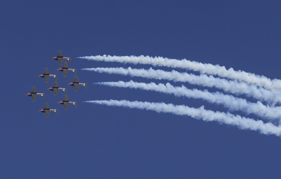 The Canadian air force Snowbirds perform in the sky during the 2023 Abbotsford International Airshow in Abbotsford, British Columbia, Canada, on Aug. 12, 2023. As one of the biggest airshows in Canada, the 2023 Abbotsford International Airshow takes place here from Aug. 11 to Aug. 13. (Photo by Liang Sen/Xinhua)