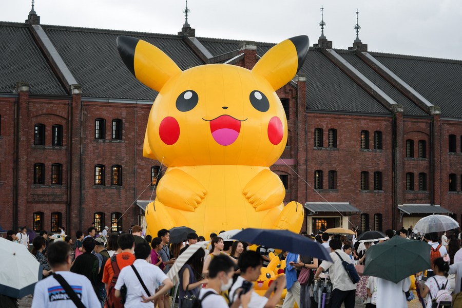 An inflatable Pikachu is seen at Minatomirai in Yokohama, Japan, Aug. 13, 2023. To commemorate the launch of the 2023 Pokemon World Championships, a Pokemon festival is held in Yokohama's Minatomirai from Aug.11 to Aug.14. (Xinhua/Zhang Xiaoyu)