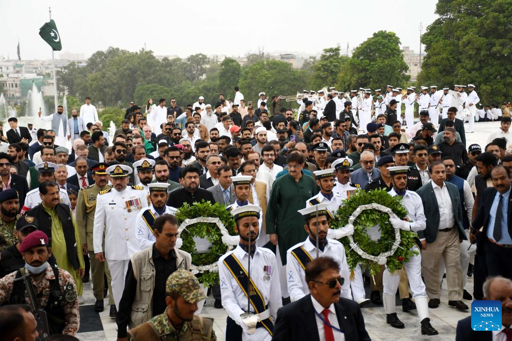 People attend a ceremony at the mausoleum of the founder of Pakistan Muhammad Ali Jinnah to mark the 76th anniversary of national independence in southern Pakistan's Karachi on Aug. 14, 2023. (Str/Xinhua)