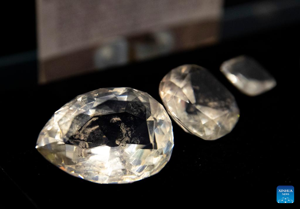This photo taken on Aug. 13, 2023 shows the replicas of Cullinan Diamond and diamonds cut from it at the Cullinan mine in Cullinan of Gauteng, South Africa. (Xinhua/Zhang Yudong)