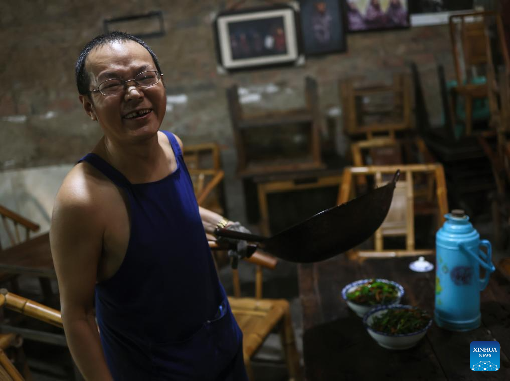 Li Qiang, the current owner of the Guanyinge teahouse, is pictured in Shuangliu District of Chengdu, capital of southwest China's Sichuan Province, Aug. 7, 2023. Guanyinge, located on a riverside at an ancient street in Shuangliu District of Chengdu, is a teahouse with a history of more than one hundred years.