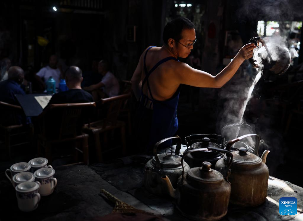 Li Qiang, the current owner of the Guanyinge teahouse, pours water into a pot at Guanyinge teahouse in Shuangliu District of Chengdu, capital of southwest China's Sichuan Province, Aug. 7, 2023. Guanyinge, located on a riverside at an ancient street in Shuangliu District of Chengdu, is a teahouse with a history of more than one hundred years.