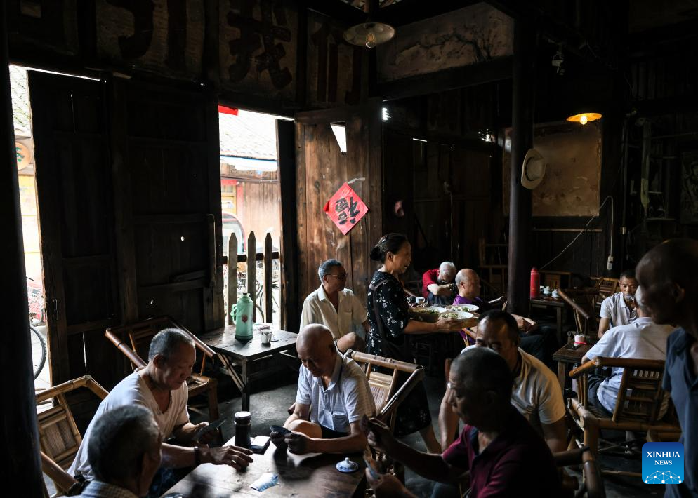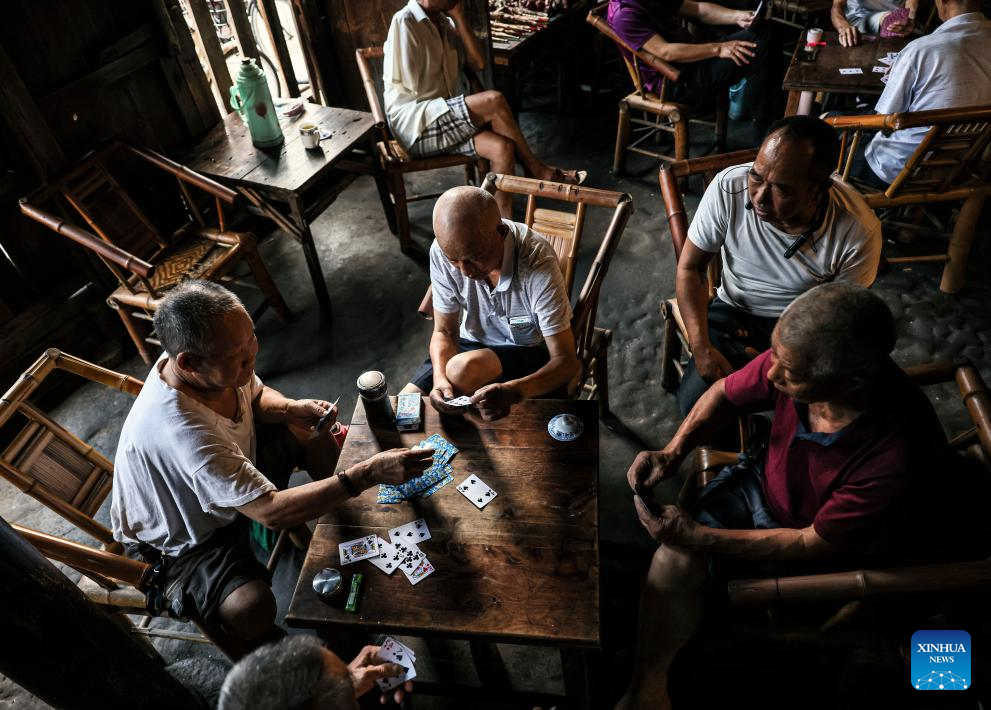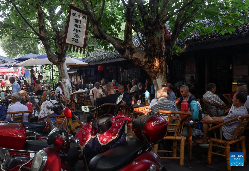 Senior citizens enjoy their leisure time at Guanyinge teahouse in Shuangliu District of Chengdu, capital of southwest China's Sichuan Province, Aug. 7, 2023. Guanyinge, located on a riverside at an ancient street in Shuangliu District of Chengdu, is a teahouse with a history of more than one hundred years.