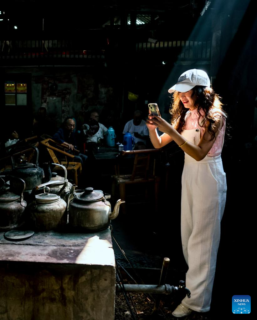 A tourist takes a photo of Li Qiang, the current owner of the teahouse, at Guanyinge teahouse in Shuangliu District of Chengdu, capital of southwest China's Sichuan Province, Aug. 7, 2023. Guanyinge, located on a riverside at an ancient street in Shuangliu District of Chengdu, is a teahouse with a history of more than one hundred years.